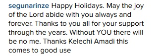 Veteran actor, Segun, took to his Instagram and posted the above photo with his wife and wrote; "Happy Holidays. May the joy of the Lord abide with you always and forever. Thanks to you all for your support through the years. Without YOU there will be no me. Thanks Kelechi Amadi this comes to good use."
