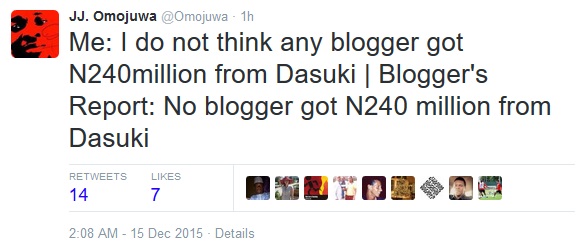 Nigerian blogger, public speaker and social media expert, Japheth Omojuwa, has taken to his Twitter to clarify the allegations that popular female blogger, Linda Ikeji was allegedly paid N240 million by embattled former National Security Adviser, Sambo Dasuki from the much publicized $2.1 billion arms deal.